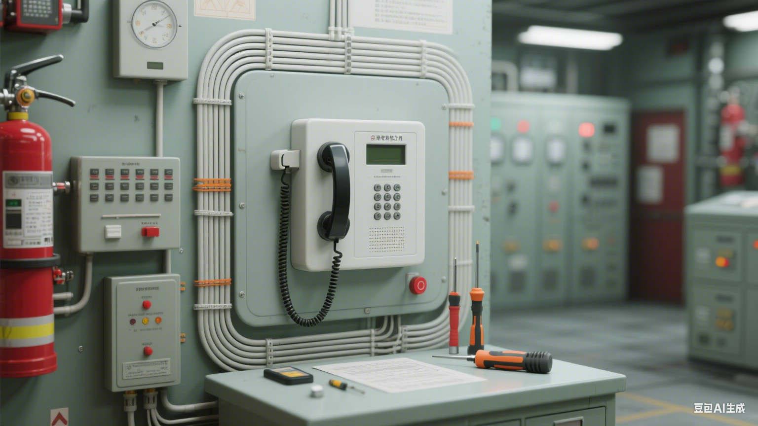 现场勘察:结合建筑图纸确定分机安装位置,需满足:设备房分机安装在值班人员易触及处(如控制柜旁);疏散通道分机安装在墙面距地面 1.3-1.5m 高度;电话插孔每隔 30m 布置 1 个(人员密集场所每隔 20m),且避开强电磁干扰源(如配电箱、电机),防止信号受影响。